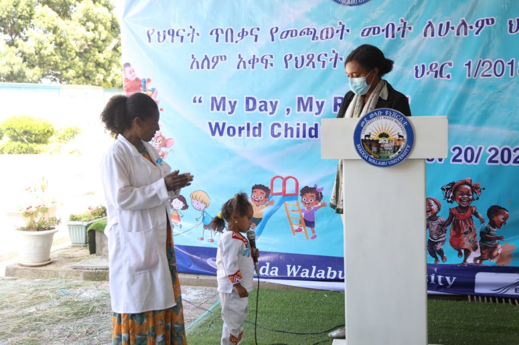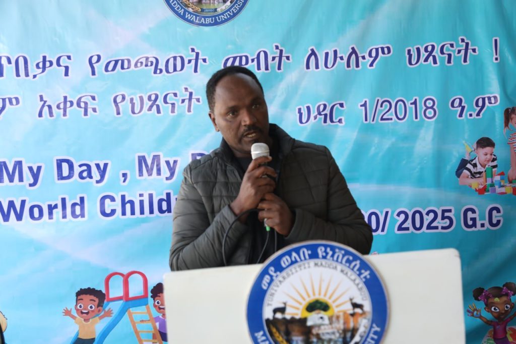 በመደ ወላቡ ዩኒቨርሲቲ “የህፃናት ጥበቃ ቀን የመጫወት መብት ለሁሉም ህፃናት” በሚል መሪ ቃል በደማቅ ሁኔታ ሲከበር ፕሮግራሙን በንግግር የከፈቱት የመወዩ የአስተዳደርና ልማት ም/ፕ አቶ ኢሳ ሀሰን ህጻናት የነገ ሀገር ተረካቢና ተስፋ በመሆናቸው ሁሉም ዜጋ መብታቸውን ጠብቆ የማሳደግና የመንከባከብ ሀላፊነት እንዳለበት አስምረውበታል፡፡